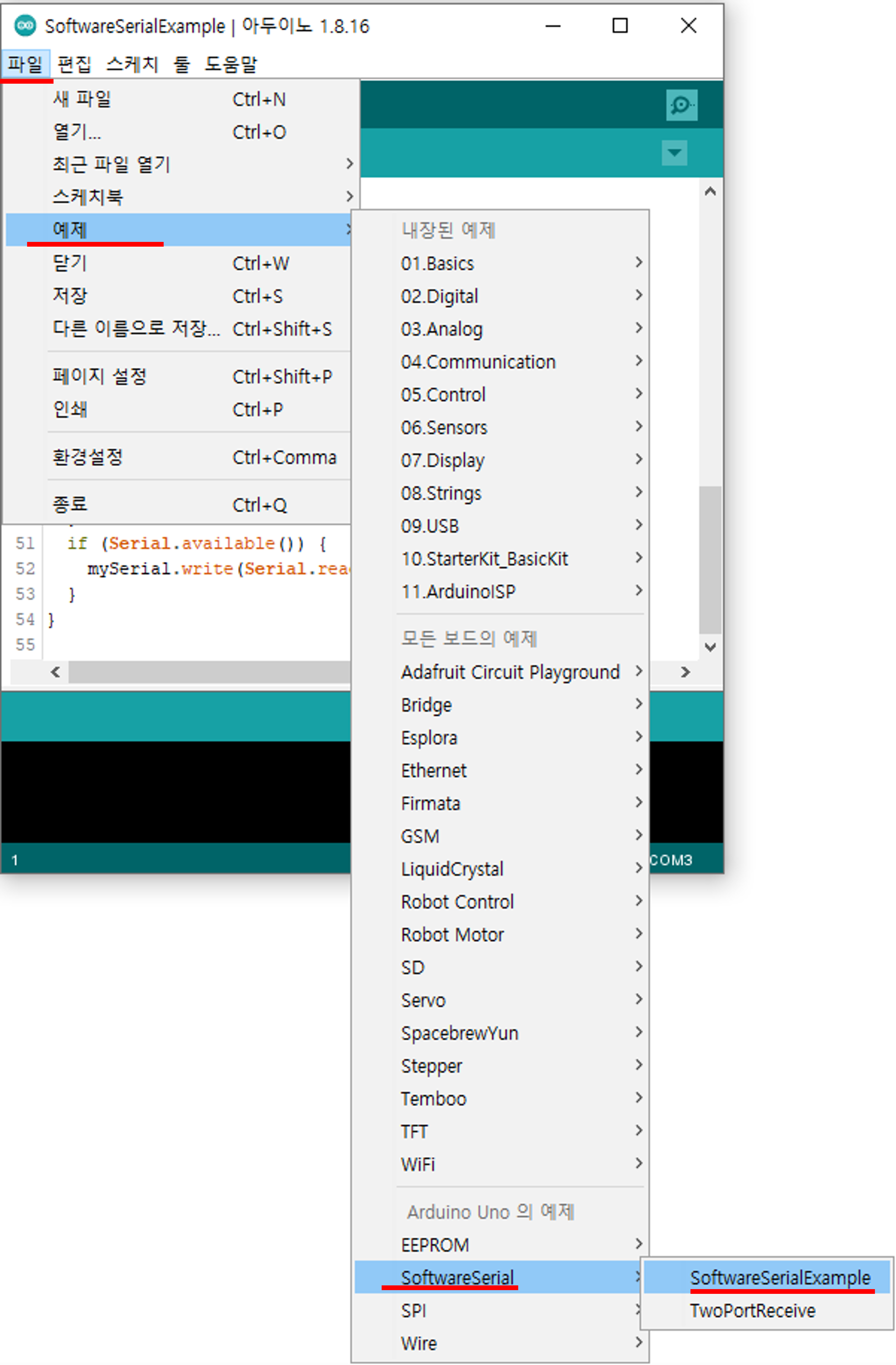 - 예제를 불러오기 위해서 파일메뉴 -> 예제 -> SoftwareSerial -> SoftwareSerialExample 을 선택해줍니다. 나중에 또 이야기 하겠지만 예제코드 들은 아두이노 코딩 시 아주 도움이 되는 표준 코드로 응용하기에 따라 다양하게 구현이 가능하기 때문에 시간이 되면 회로구성과 함께 실습해보는 것도 좋습니다.