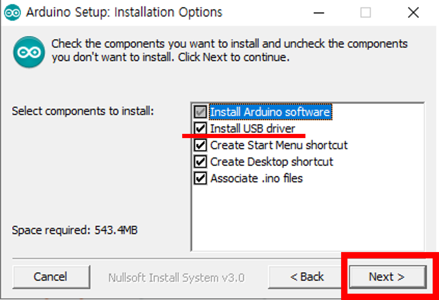 - 위의 페이지에 가면 설치과정에 대한 스크린샷과 함께 설치 옵션에 대한 설명이 있습니다. 우선 기본선택으로 두고 Next를 클릭하여 넘어갑니다. 중요한 것은 Install USB driver 선택은 필수라는 것입니다.