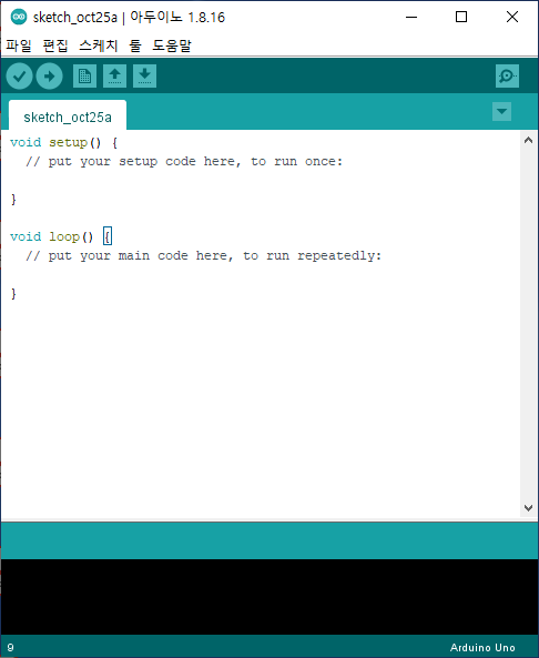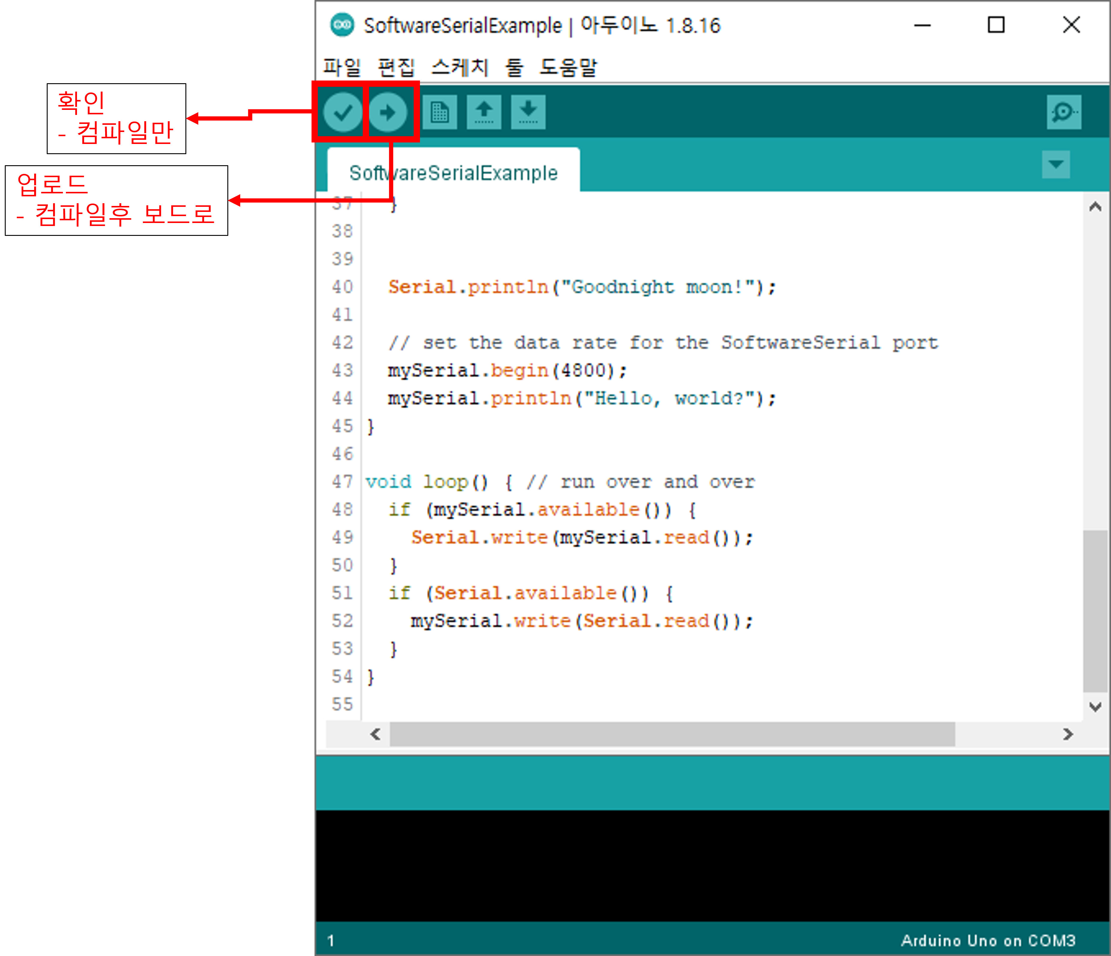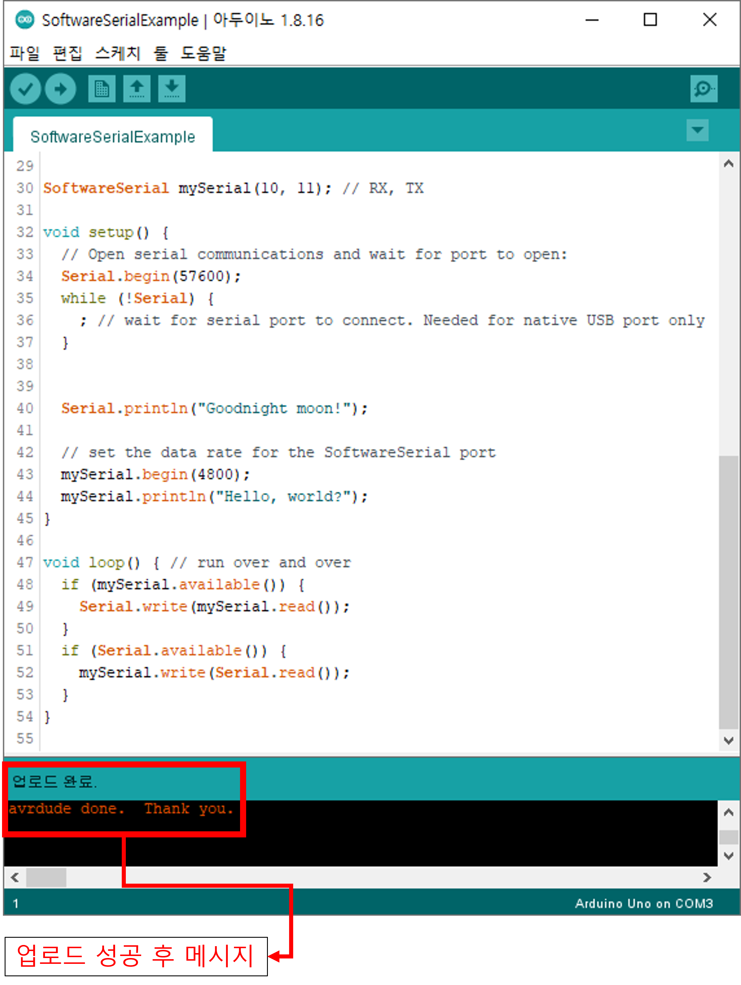 - 업로드 전 컴파일이 진행되면서 하단에 검은 부분에 컴파일 과정에서 나오는 메시지가 나오며 업로드 중 메시지도 함께 출력됩니다. 메시지들을 유심히 보면 나중에 도움이 많이 되는데 초심자들은 그냥 업로드 완료 메시지만 보면 됩니다.