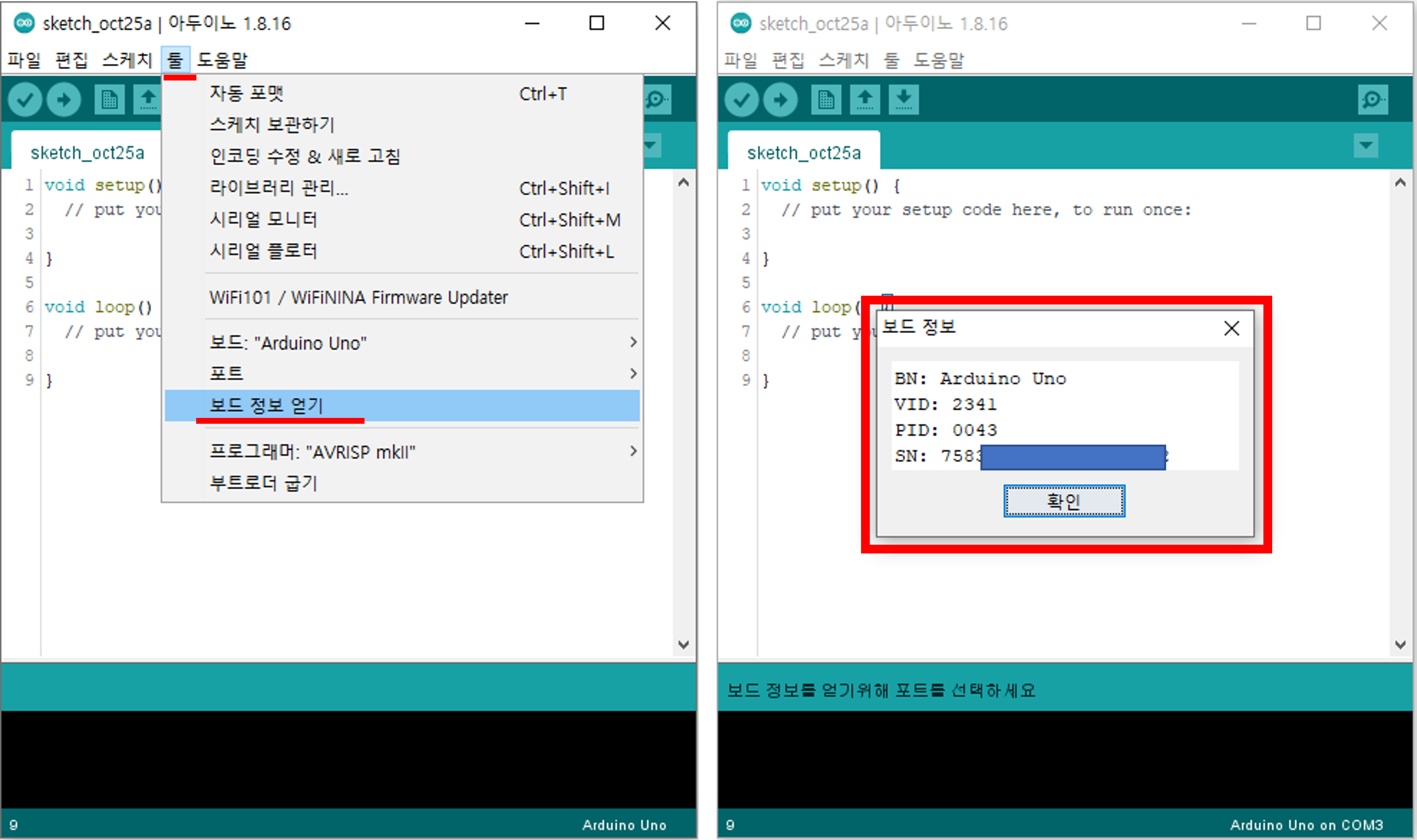 - 시리얼포트까지 선택해주었다면 다음은 툴메뉴->보드 정보 얻기 를 선택해 보드에 대해 정보가 잘 올라오는지 확인해봅니다. 이부분까지는 거의 한번만 하면 다시 할일이 없지만 그래도 한번은 해보는 것이 좋습니다. 위와 같이 자기 보드에 대한 정보가 잘 올라오면 이제 코딩을 진행할 준비가 된 것입니다.