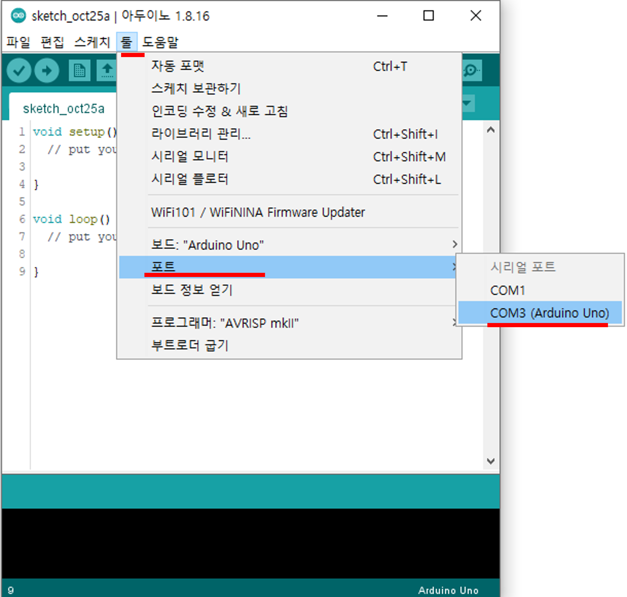 - 그다음 해야 할 작업은 보드의 시리얼 포트를 잘 인식하고 있는지 확인하는 것입니다. 툴메뉴-> 포트 -> 컴포트 선택 과정을 거쳐야 하는데 위의 장치관리자 화면에서 보았던 아두이노의 시리얼통신용 COM 포트를 선택해주어야 합니다. 이부분이 안되면 드라이버 설치과정을 거쳐야 하겠죠.