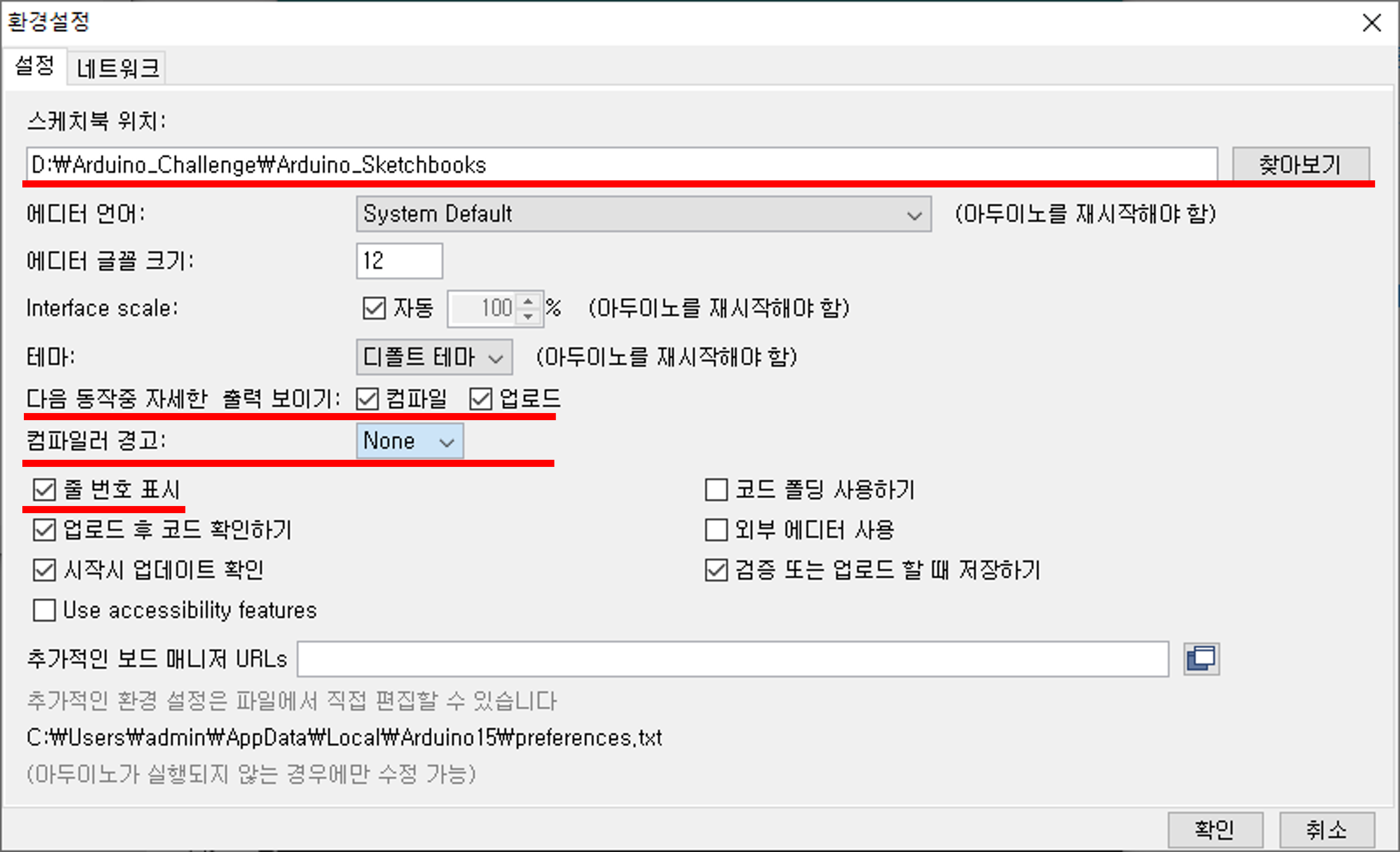 - 기본적인 설정을 먼저 해주는 것이 좋은데요. File메뉴 -> 환경설정을 선택하여 환경설정 창을 열어 입맛에 맞게 설정하면 되는데 개인적으로 가장 중요한 설정은 ‘스케치북 위치’라고 봅니다. 그대로 두고 사용해도 되지만 자기가 코딩하는 프로그램을 단위별로 관리하는 스케치북들이 어디로 저장될지 결정하는 것이기 때문에 평소 자기가 편한 위치로 지정해주시면 됩니다.