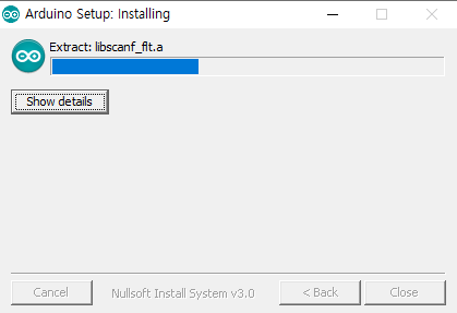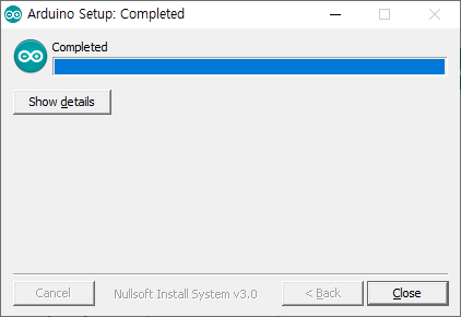 - IDE 설치 중 나오는 드라이버를 모두 설치하고 모든 설치 과정이 마무리 되었으면 close 버튼이 나오며 설치과정에 종료됩니다. PC에 문제가 있지 않다면 아두이노 IDE가 실행될겁니다.