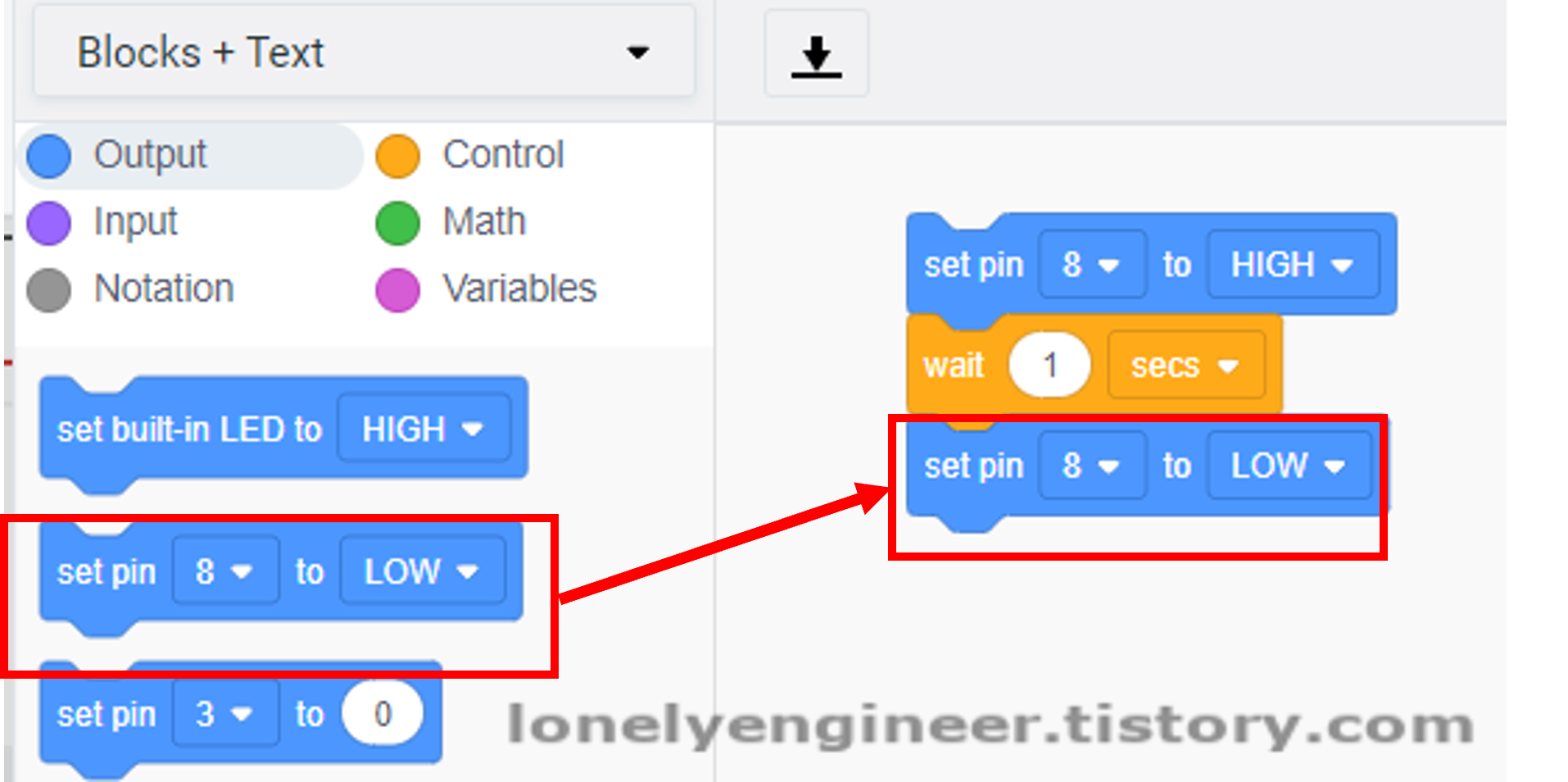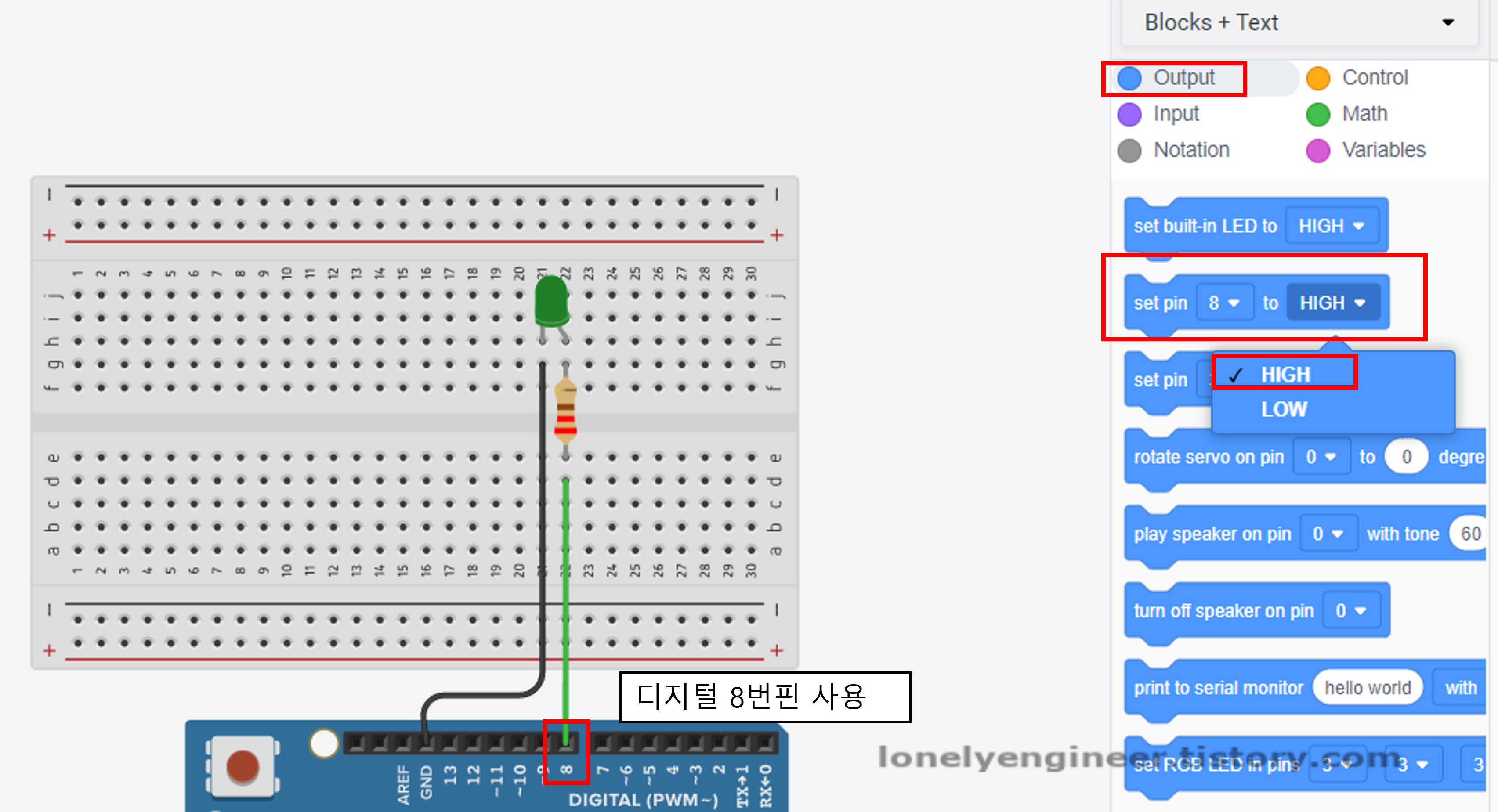 - 일단 디지털 8번핀을 사용하기 때문에 블록의 출력(Output)에서 디지털핀 제어에 해당하는 블록을 높음(HIGH)로 설정해줍니다. ‘핀 8을(를) 높음 (으)로 설정’ 블록이 되겠네요. 그리고 블록을 오른쪽으로 끌어다 놓습니다.