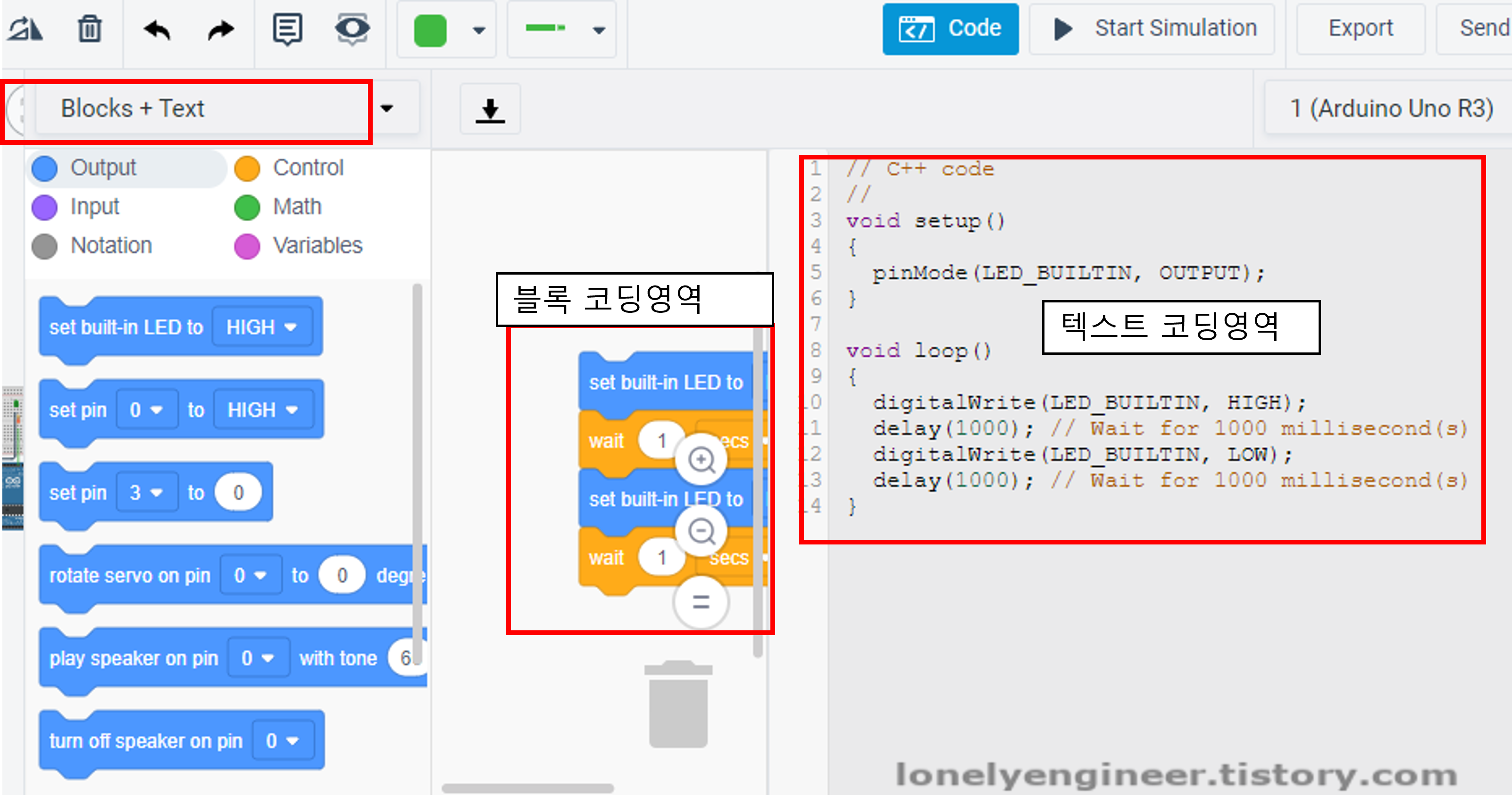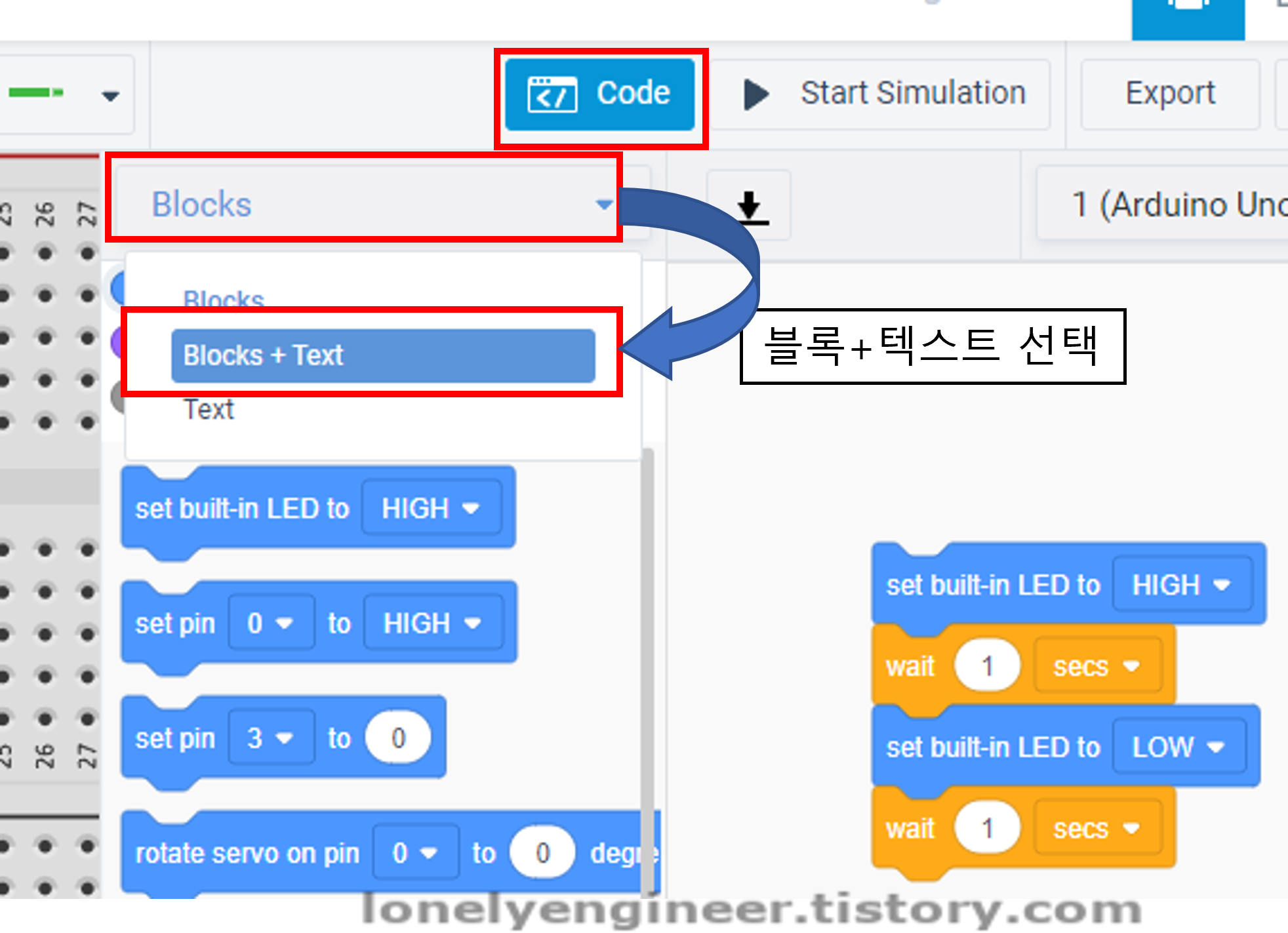 - 이제 회로 연결은 끝났습니다. 실제 동작을 위한 코드를 작성해야 합니다. 코드(Code) 버튼을 눌러주면 아두이노가 추가되어 있기 때문에 코딩이 가능한 창이 나옵니다. 코드는 블록+텍스트(Blocks + Text) 모드에서 작성합니다. 그래야 나중에 C언어로 코딩하는데도 도움이 되기 때문입니다.