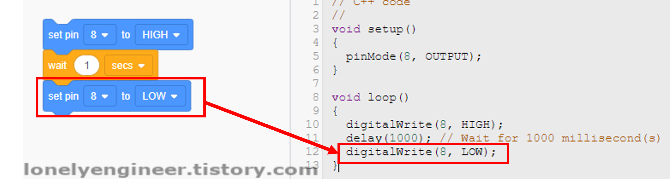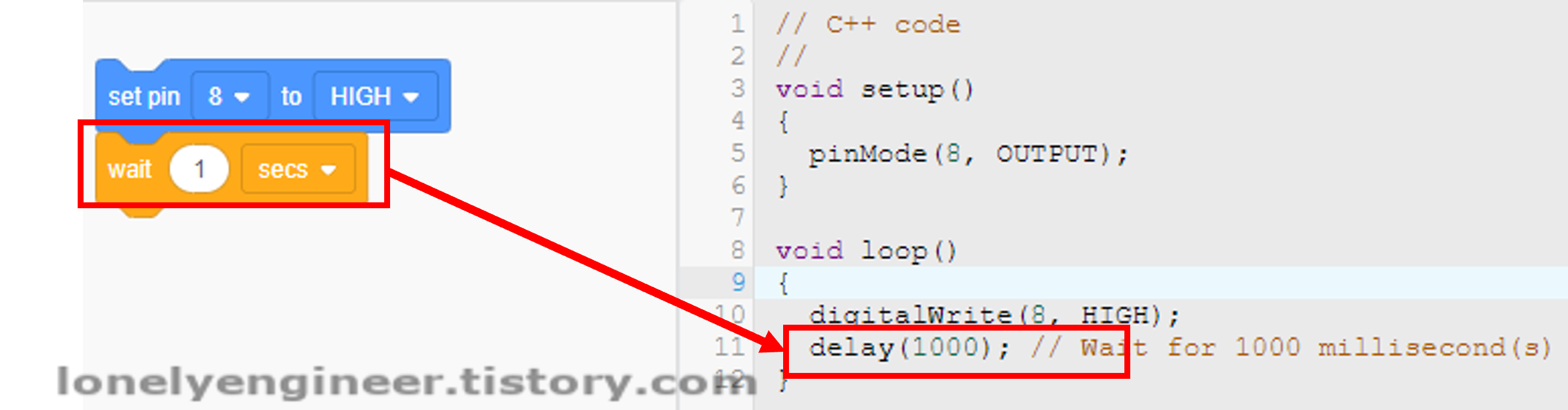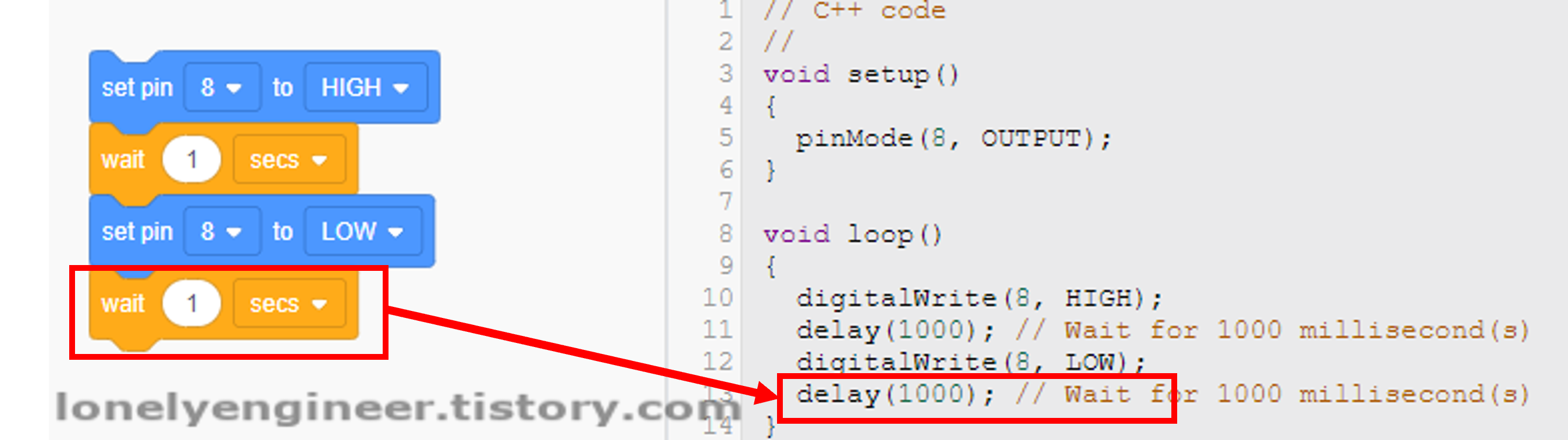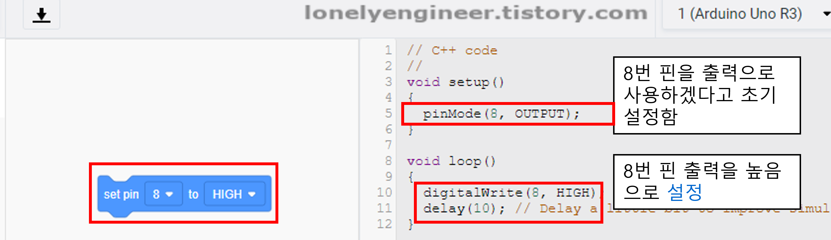 - 그래서 setup 함수에 pinMode(8, OUTPUT)이 자동으로 생성된 이유가 8번 핀에 대한 값을 출력블럭에서 사용했기 때문입니다. loop 함수에 추가된 digitalWrite(8, HIGH);는 8번핀에 디지털 값 HIGH(높음, 1에 해당)를 설정한 것이며 delay(10)은 자동으로 붙었는데 delay(지연하고 싶은 밀리세컨드 값)의 의미로 다음 동작이 너무 빠르게 설정되는 것을 방지하기 위함이 아닌가 싶습니다.
