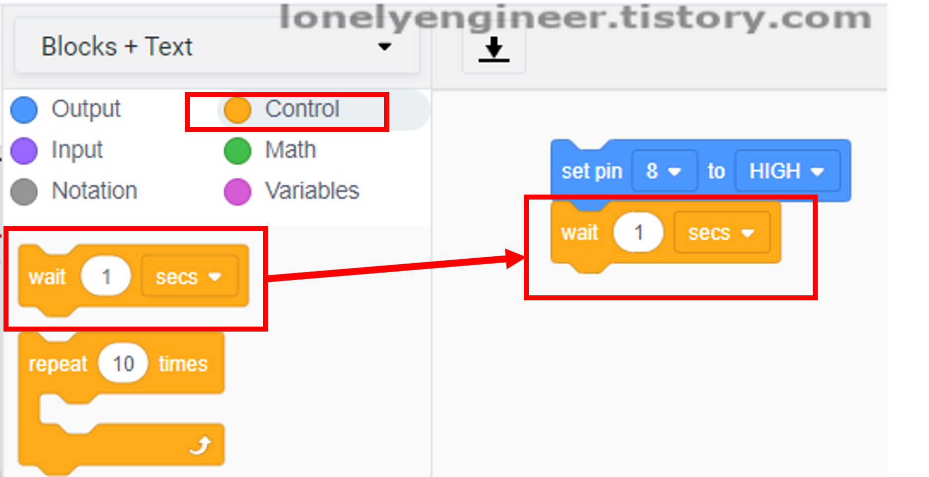 - 이번에는 1초 대기 후에 LED를 꺼볼 것이기 때문에 제어(control) 블록에서 ‘대기(wait) 1초’를 끌어다가 블록에 붙여줍니다.