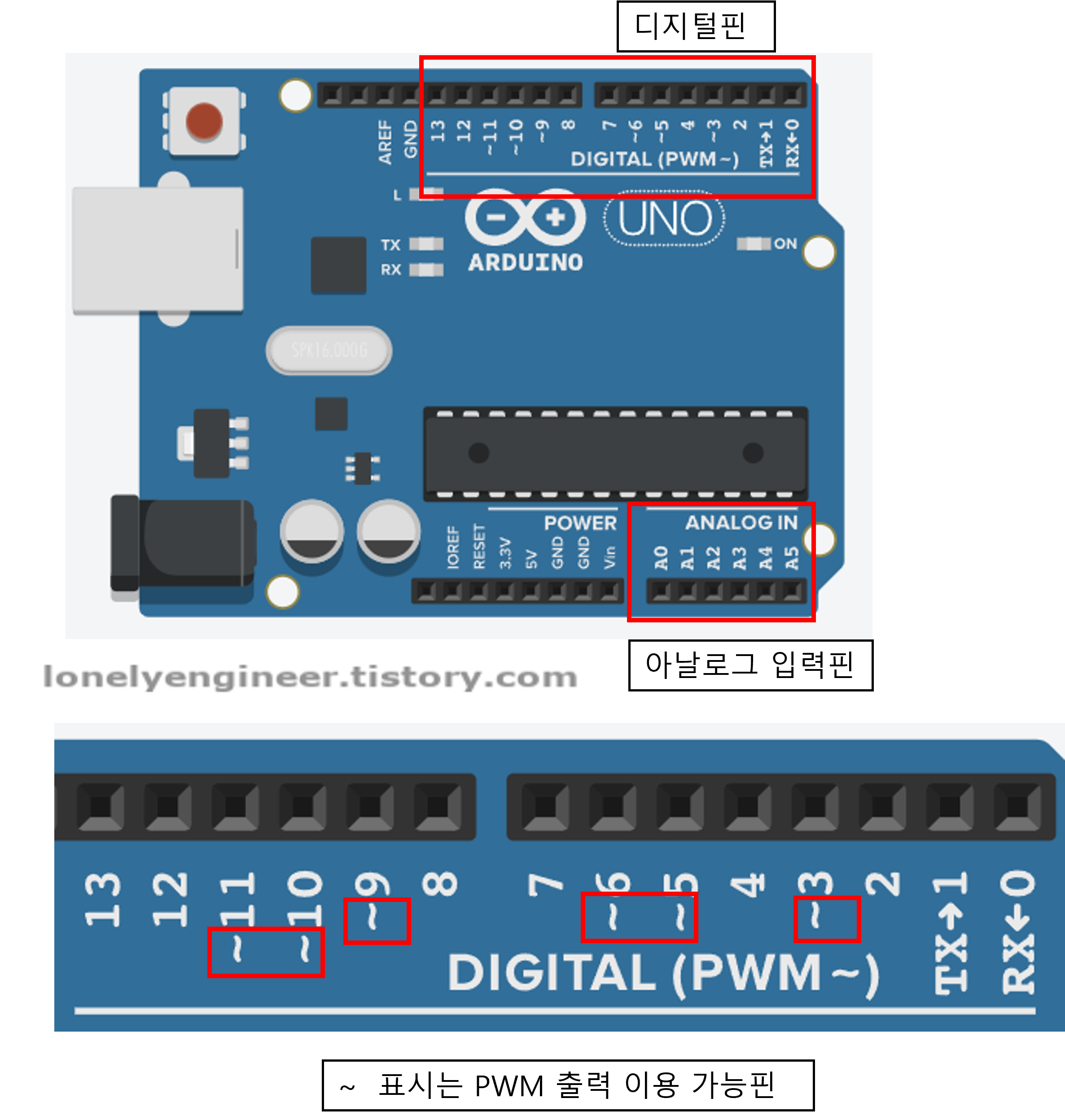 - 나중에 따로 이야기할 시간이 될지 모르겠어서 미리 기재해봅니다만 아두이노에 ‘Digital(PWM~)’ 이라고 기재되어 있는 부분의 핀은 디지털 핀으로 사용 가능합니다. ‘PWM~’의 의미는 핀번호 앞에 ‘~’ 표시가 있는 것은 PWM 출력으로 사용 가능하다는 뜻입니다.