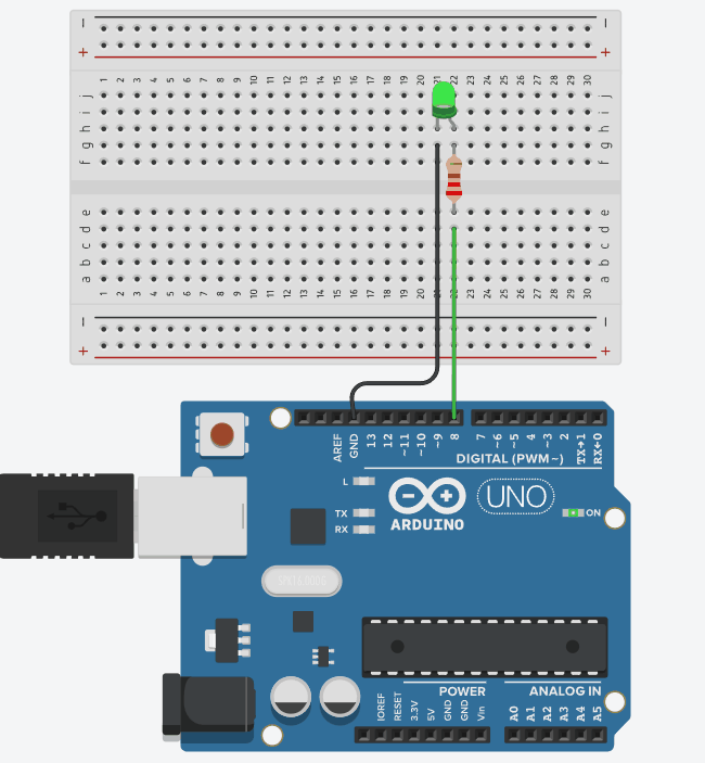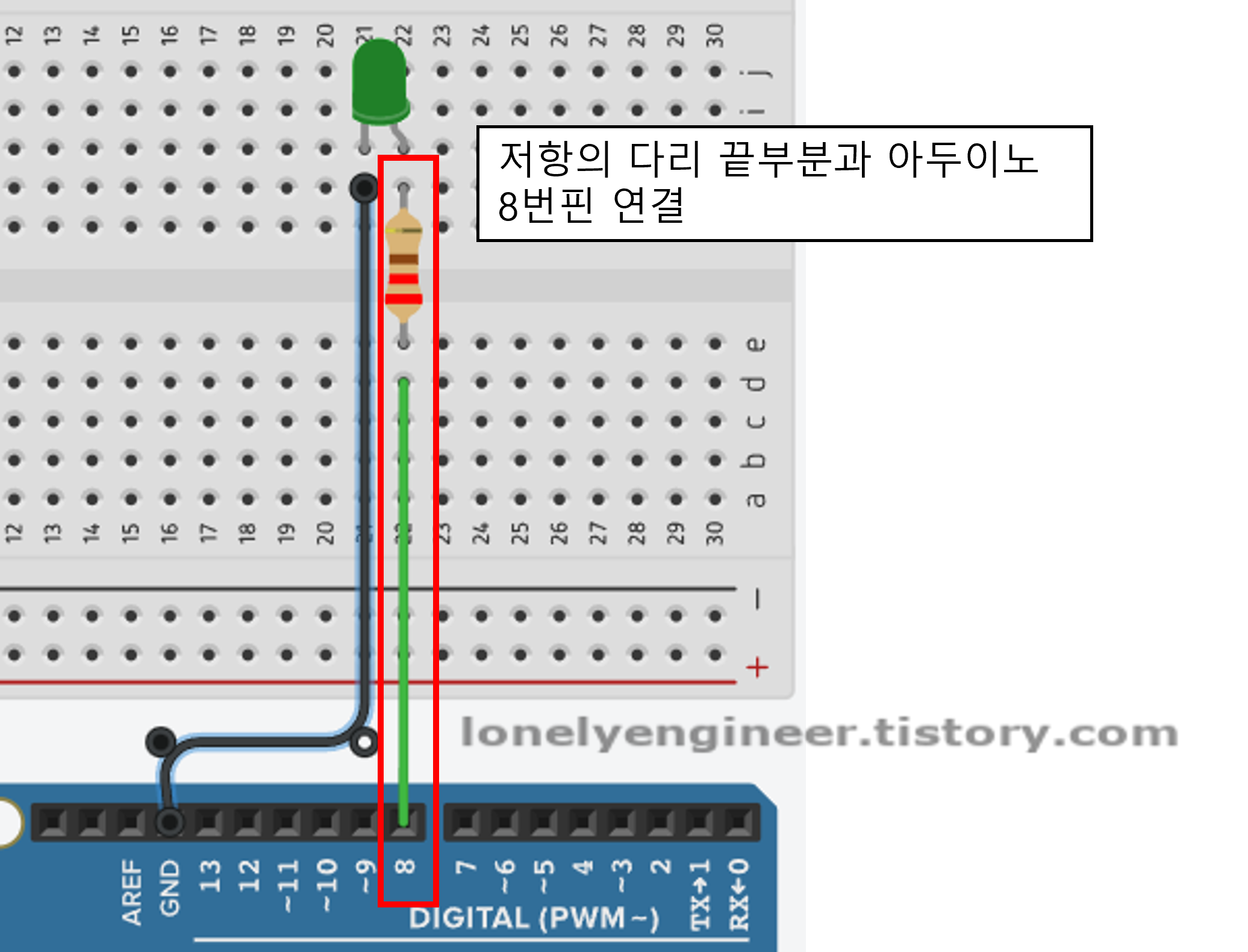 - 아두이노의 디지털핀(0~13번핀) 중에 하나를 선택해서 사용합니다. 편의상 8번 핀을 이용하겠습니다. 8번 핀과 저항의 다리를 연결해줍니다. 신호선은 녹색으로 합니다.(단축키 ‘5’ 입니다.)