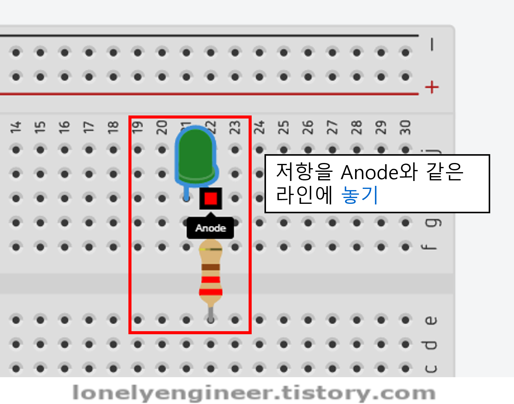 - 이제 부품들을 서로 연결해줄겁니다. 우선 브레드보드에 LED를 놓고 저항을 애노드(Anode) 쪽에 브레드 보드의 같은 라인에 위치하게 놓습니다.