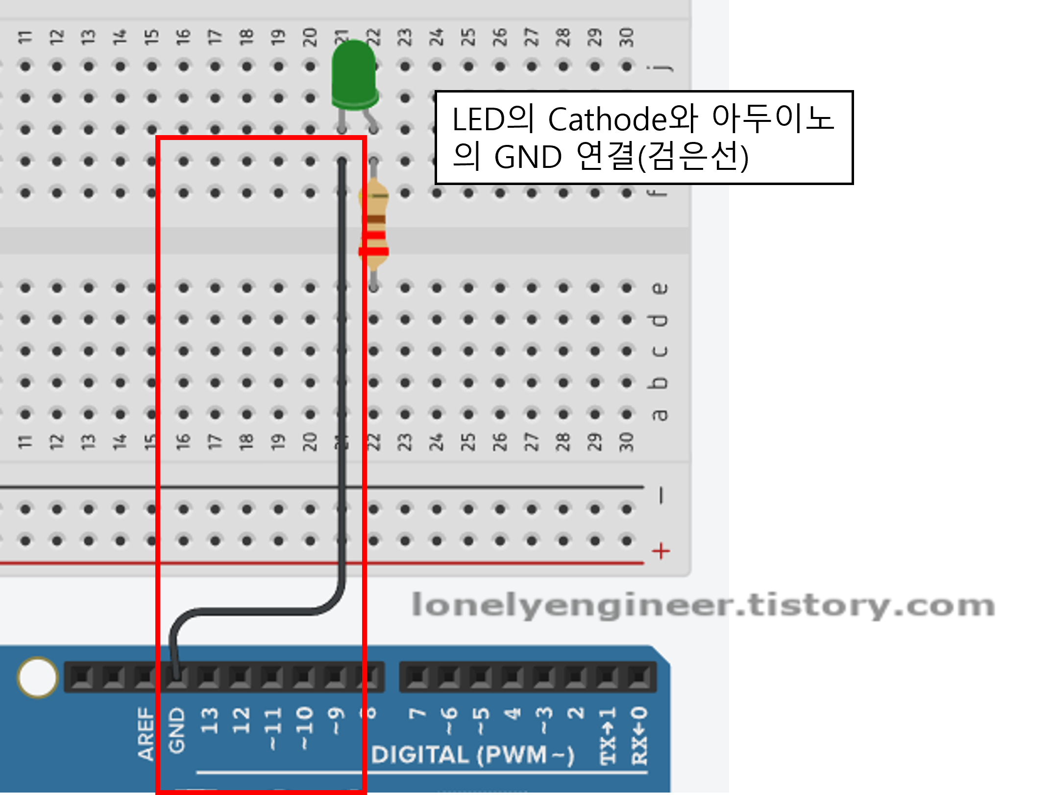 - 그리고 LED의 캐소드(Cathode) 핀과 아두이노의 GND핀을 클릭해가며 검은색 선으로 연결해줍니다. (이때 선 색깔 지정의 단축키는 선이 선택된 상태에서 ‘1’키를 눌러줍니다.)