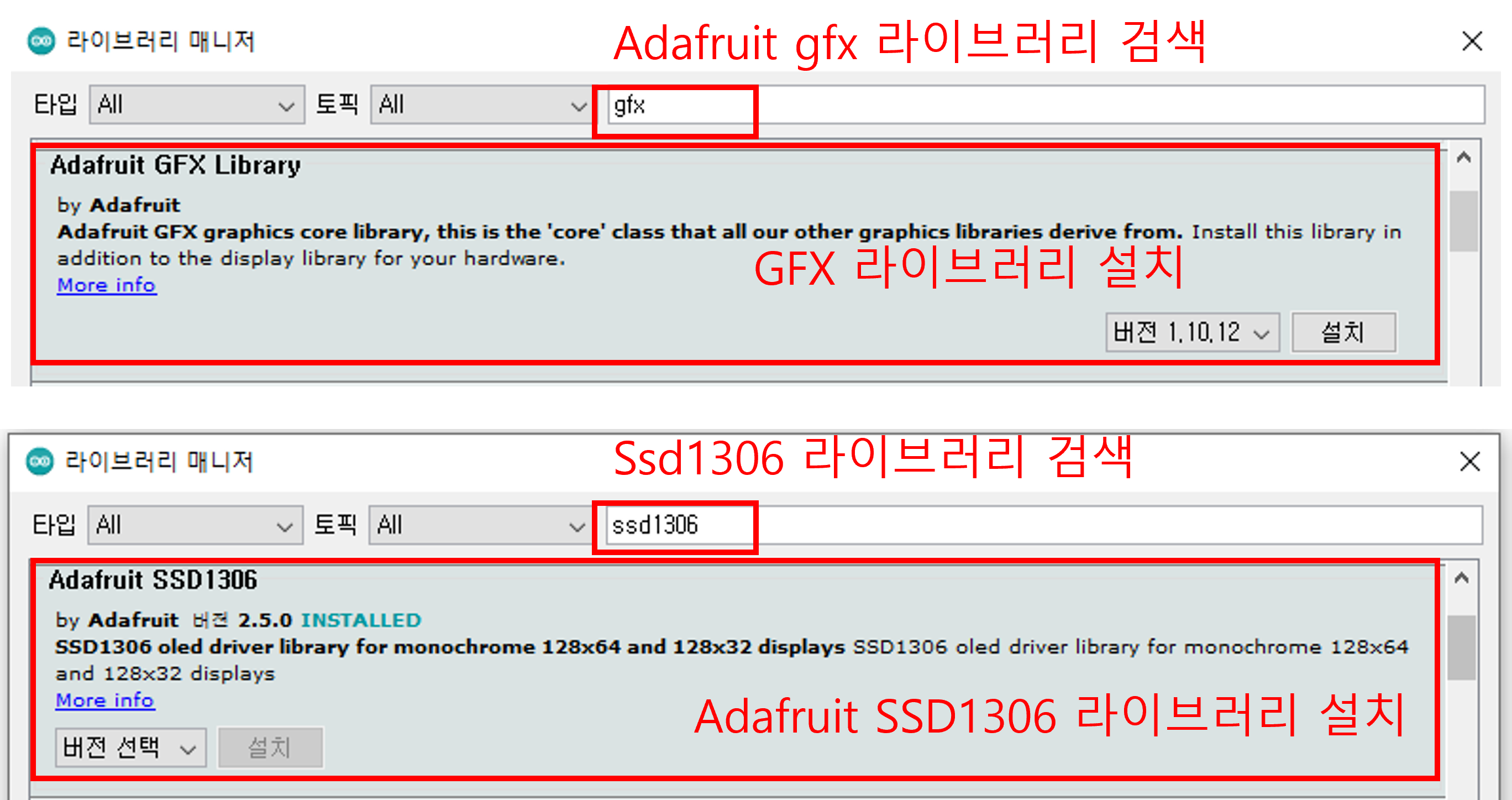 아두이노 IDE에서 툴→ 라이브러리 관리에서 adafruit gfx, ssd1306을 검색하여 라이브러리 설치