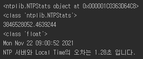 import ntplib from time import ctime time_server = 'time.windows.com' # URL 또는 IP 지정 가능 ntp_client = ntplib.NTPClient() response = ntp_client.request(host=time_server, version=3) print(response) print(type(response)) print(response.recv_timestamp) print(type(response.recv_timestamp)) print(ctime(response.tx_time).) print(f"NTP 서버와 Local Time의 오차는 {response.offset:.2f}초 입니다.") 참고 사이트 - https://py..