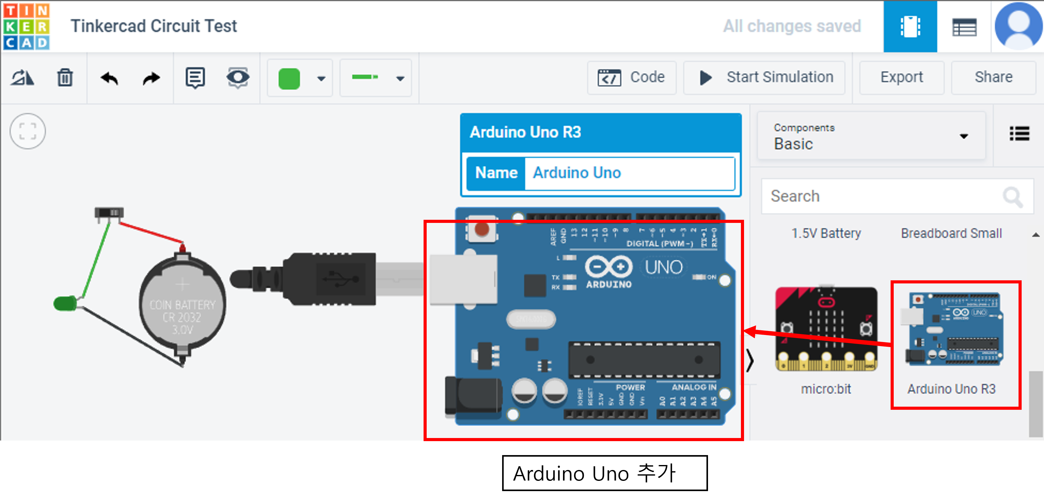 이번 포스트에서는 아두이노를 이용해서 1개의 LED를 켜고 끄는 예제를 틴커캐드(Tinkercad) 서킷으로 시뮬레이션 해보려고 합니다. 1. 회로 디자인 – Circuit Design우선 서킷에서 ‘새 회로 작성’을 눌러 새로운 회로판을 생성해주고 이름을 구분하기 좋게 변경합니다. 편의상 ‘1 LED Blinking example’ 로 지정했습니다. 아두이노 프로젝트이기 때문에 아두이노를 하나 끌어다 놓습니다. 편의상 아두이노 UNO 보드를 사용합니다. 그리고는 브레드보드(Breadboard small) 1개 LED 1개를 끌어다 놓습니다. LED는 잘보이도록 녹색(Green)으로 하겠습니다. 나중에 따로 이야기할 시간이 될지 모르겠어서 미리 기재해봅니다만 아두이노에 ‘Digital(PWM..